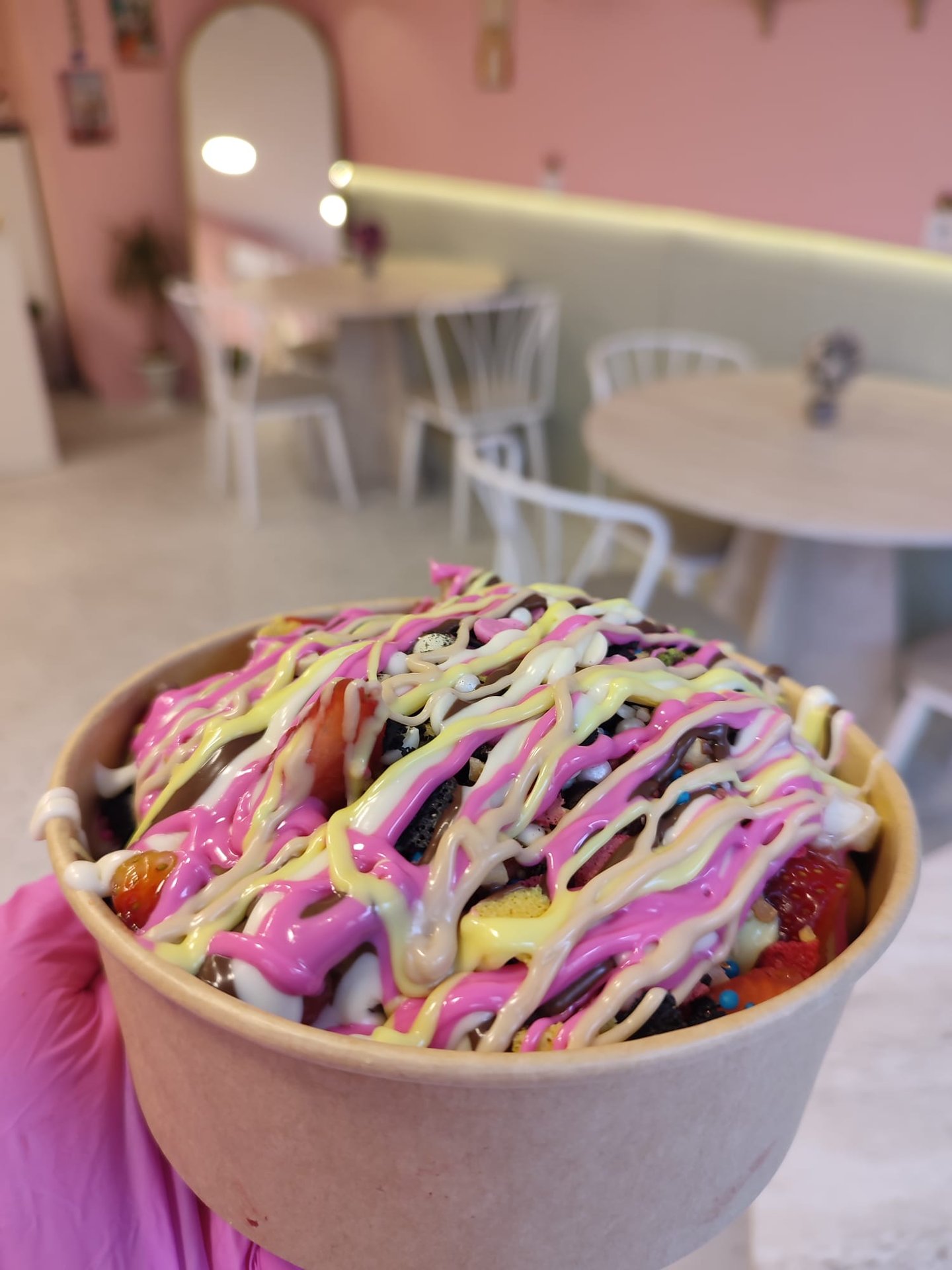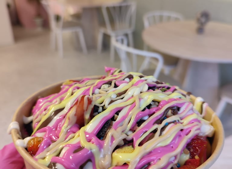 Bardak ve kova waffle seçeneklerimizle, sınırsız süsleme seçeneğine ilaveten farklı aromalarda çikolata sosları, taze muz ve çilek ile tatlandırıyoruz.